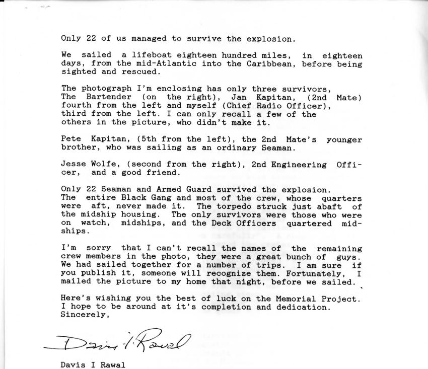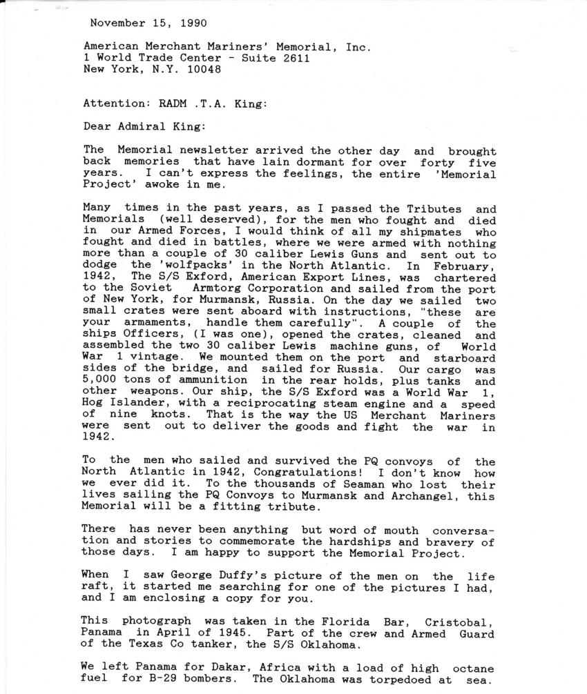 Dave was interested in the American Merchant Mariners Memorial that was built in Battery Park and dedicated on Oct. 8, 1991. Here's a letter he wrote to the President of the foundation, with the picture he sent them: